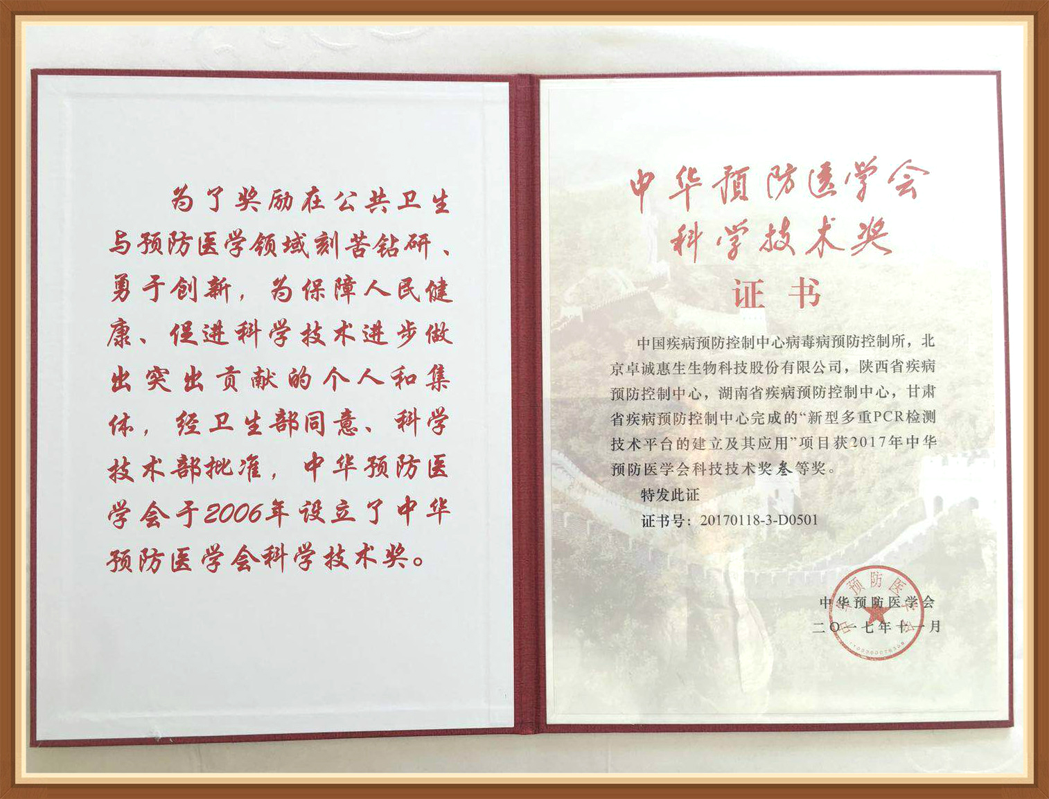 這一年,卓誠人齊心協(xié)力,深耕行業(yè),由我司與中國疾病預(yù)防控制中心病毒病預(yù)防控制所、陜西省疾病預(yù)防控制中心、湖南省疾病預(yù)防控制中心、甘肅省疾病預(yù)防控制中心合作完成的“新型多重PCR檢測技術(shù)平臺的建立及其應(yīng)用”項目榮獲2017年中華預(yù)防醫(yī)學(xué)會科技技術(shù)獎叁等獎。