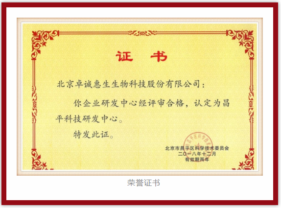 2018年12月,北京市昌平區(qū)科學技術委員會認定北京卓誠惠生生物科技股份有限公司研發(fā)中心為昌平科技研發(fā)中心,并頒發(fā)榮譽證書,熱烈祝賀?。?!
