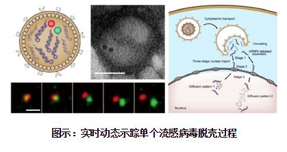 該團隊首先建立了量子點位點特異性標(biāo)記甲型流感病毒基因組技術(shù)。在病毒感染過程中,病毒核糖核蛋白復(fù)合物(vRNP)頂端的聚合酶蛋白PA被可控生物素化,與鏈霉親和素修飾的量子點特異性結(jié)合,并組裝進入成熟的子代病毒粒子,從而獲得基因組被量子點標(biāo)記的流感病毒。基于量子點的高亮度和耐光漂白等特點,利用單顆粒示蹤技術(shù),結(jié)合病毒包膜和細胞組分熒光標(biāo)記,對單顆流感病毒感染宿主細胞時的脫殼過程進行實時動態(tài)可視化分析。實時動態(tài)揭示了流感病毒在感染后30-90分鐘,病毒由早期內(nèi)體進入晚期內(nèi)體發(fā)生膜融合、基因組與病毒包膜分離、單個節(jié)段基因從晚期內(nèi)體中分別釋放、解離釋放的單個節(jié)段基因入核、及其在細胞核內(nèi)運輸?shù)膭討B(tài)過程。發(fā)現(xiàn)流感病毒八個vRNP在脫殼過程中以單獨而非組團的方式從晚期內(nèi)體中釋放進入細胞質(zhì),這些單獨的vRNP以特征性三階段主動運輸機制進入細胞核,入核后的vRNP以兩種不同的擴散模式運輸?shù)狡鋸?fù)制/轉(zhuǎn)錄位點等重要過程與機制。該研究為世界上首次記錄到單個流感病毒脫殼的實時動態(tài)過程,對深入理解流感病毒在宿主細胞中的生命周期具有重要意義,并將為開發(fā)新的抗病毒途徑提供思路。
