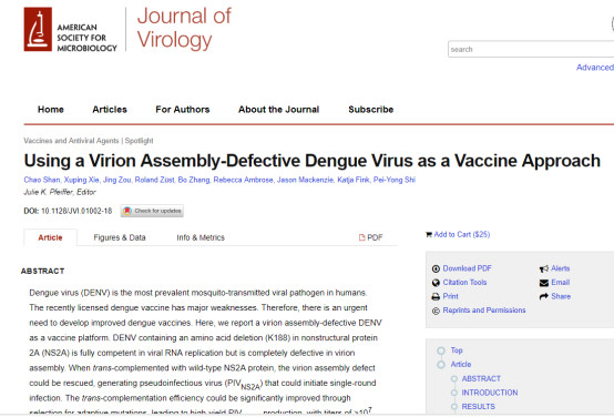 近日,來自武漢病毒研究所的科學(xué)家和美國(guó)的科學(xué)家合作,開發(fā)出了一種新的制備登革熱病毒疫苗毒株的方法,該研究成果目前已發(fā)表至《Journal of Virology》雜志,題為“Using a Virion Assembly-Defective Dengue Virus as a Vaccine Approach”。