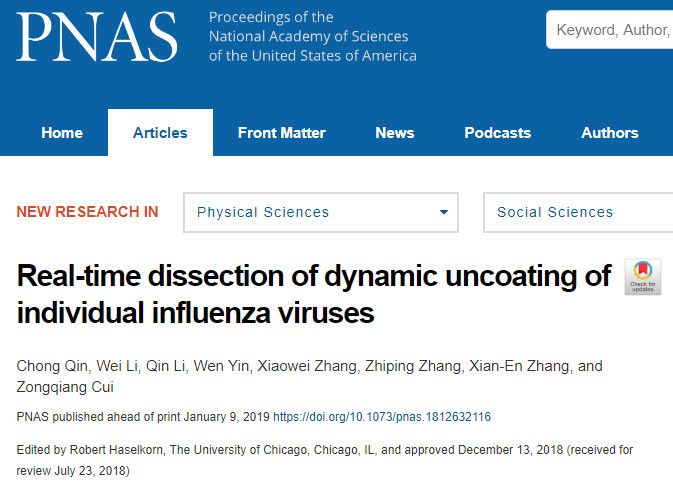 病毒學(xué)國(guó)家重點(diǎn)實(shí)驗(yàn)室崔宗強(qiáng)團(tuán)隊(duì)追蹤到單個(gè)流感病毒脫殼過程