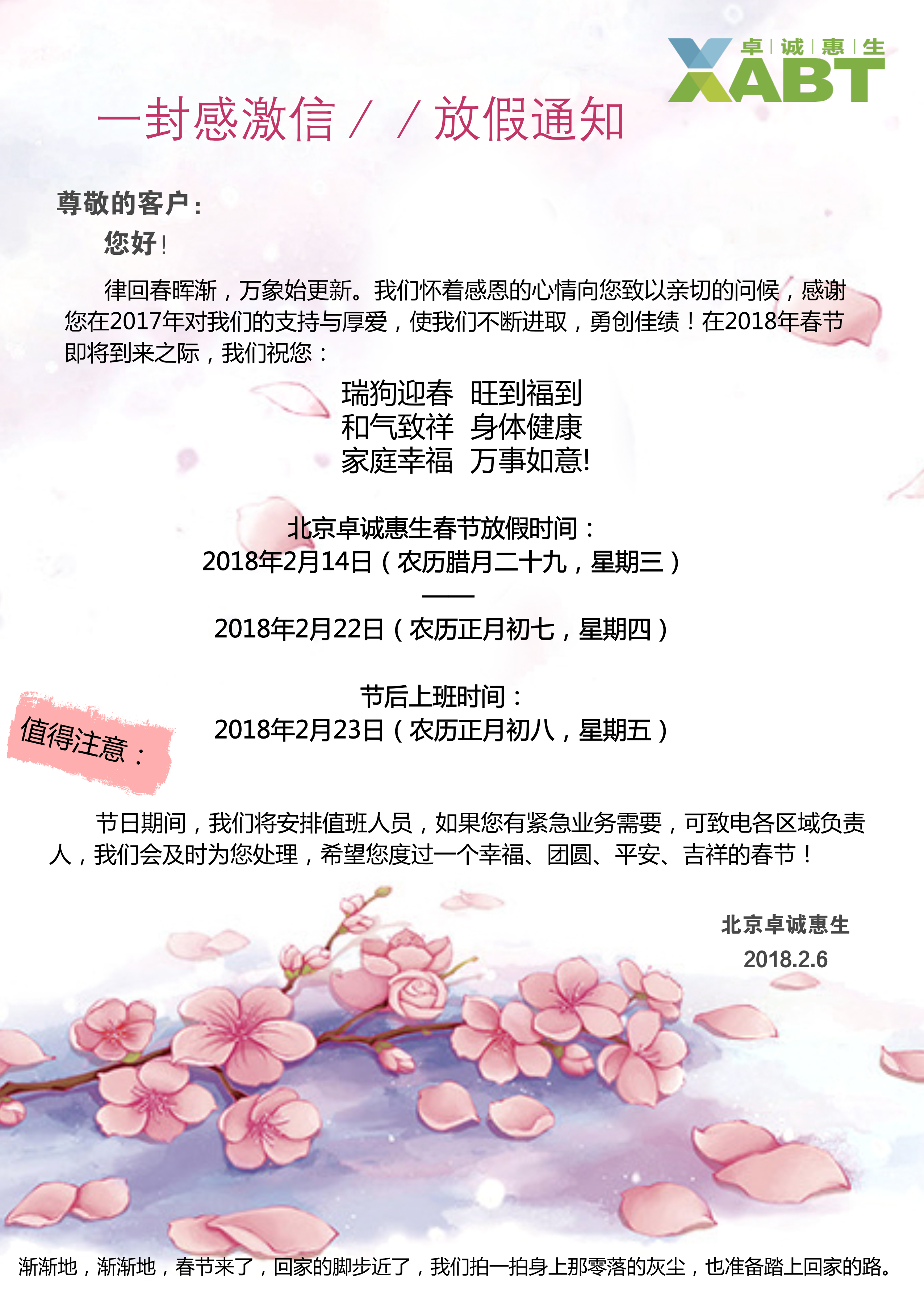 北京卓誠惠生春節(jié)放假時間:2018年2月14日至2018年2月22日,節(jié)后上班時間:2018年2月23日